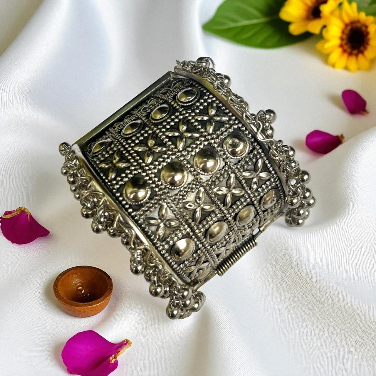 Oxidized Silver Bracelet with Corner Ghunghroo Accents – Free Size (Design 4)